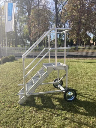 Durch Kippen der Treppen über die Achse kann die Deichsel an ein Triebfahrzeug angehängt und gezogen werden. Das beidseitige Geländer schützt den Mitarbeiter optimal gegen abstürzen.